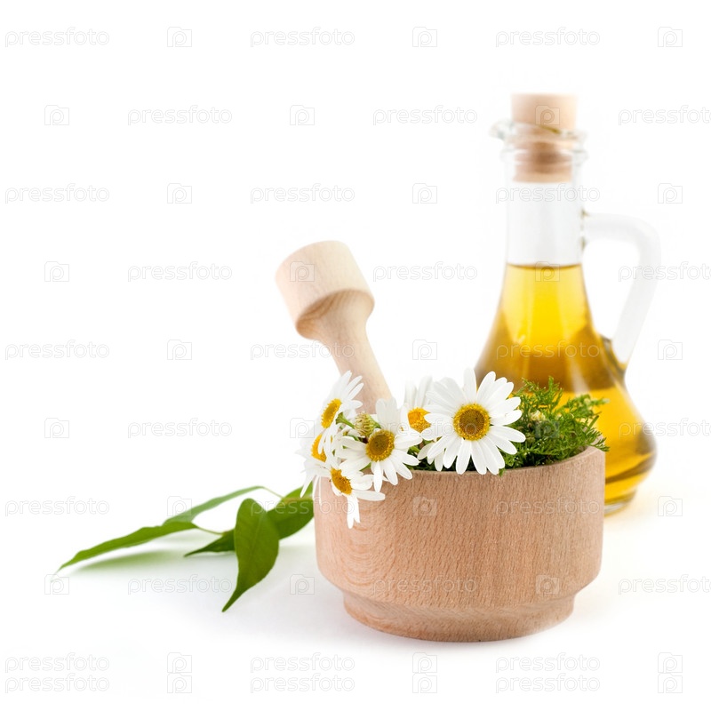 Деревянная ступка с цветами и бутылка масла для СПА массажа