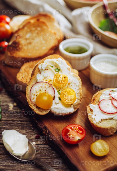 Ломтики поджаренного багета с мягким сыром