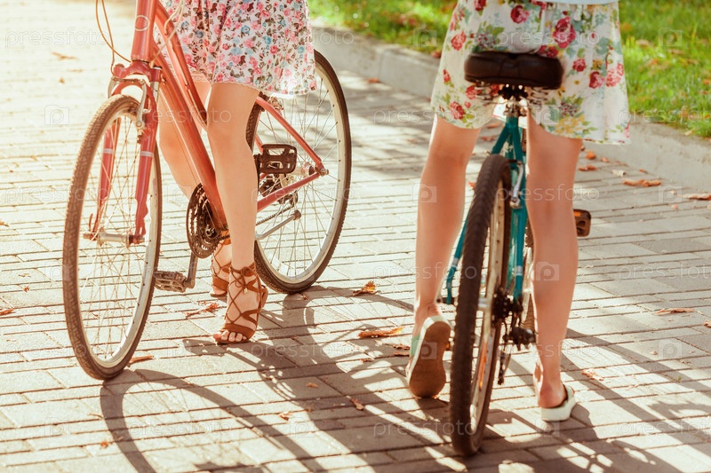Две молодые девушки с велосипедами в парке