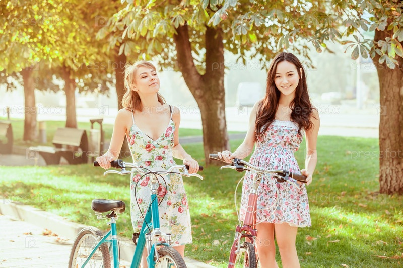 Две молодые девушки с велосипедами в парке
