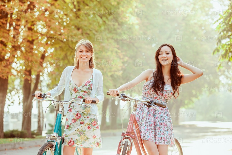 Две молодые девушки с велосипедами в парке