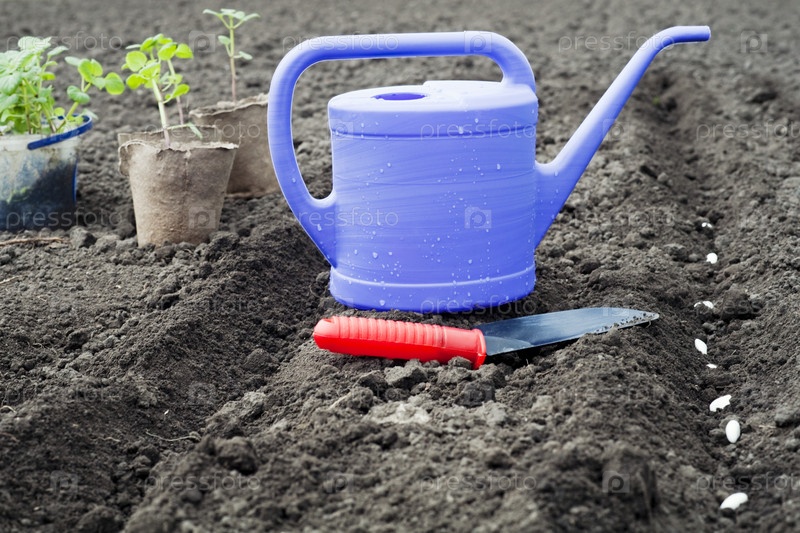 Лейка, саженцы, лопата и семена на грядке