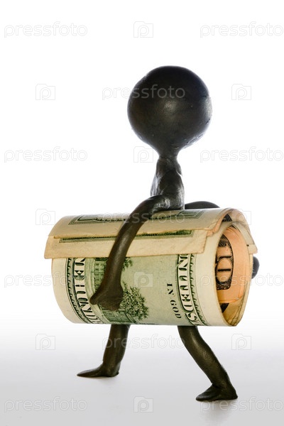 Пластилиновый человечек с долларовой банкнотой на белом фоне
