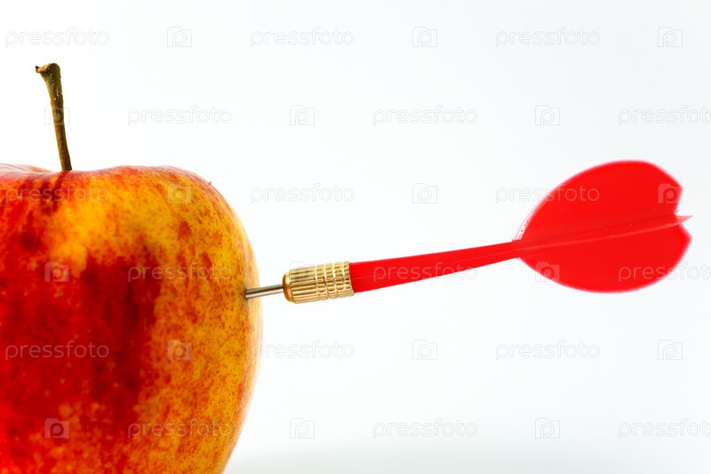 Красное яблоко с дротиком для игры в дартс на белом фоне