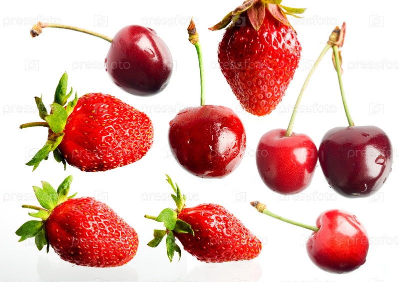 Красные ягоды клубники и вищни на белом фоне