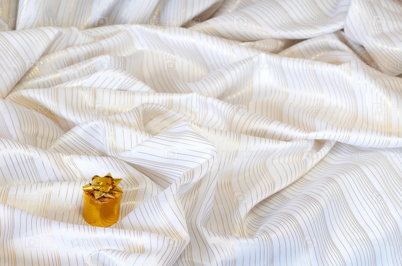 Золотая коробочка с подарком на белой ткани