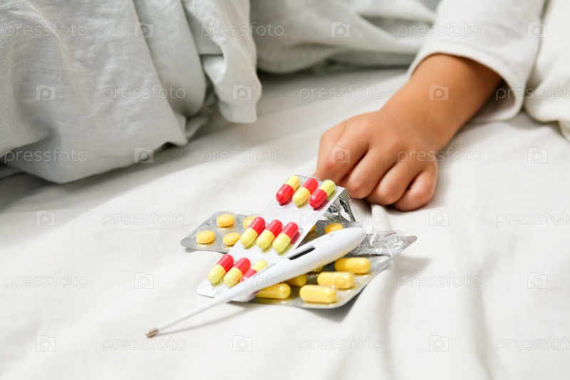 Горсть таблеток и термометр на кровати