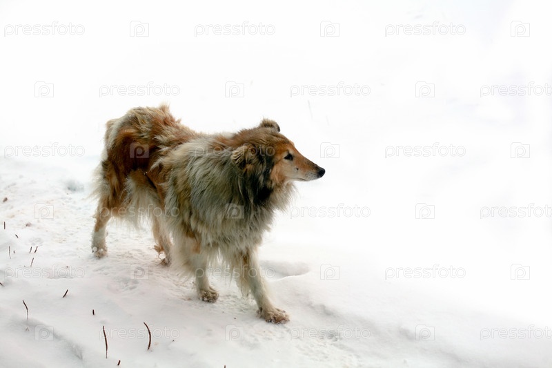 Пушистая собака на белом фоне