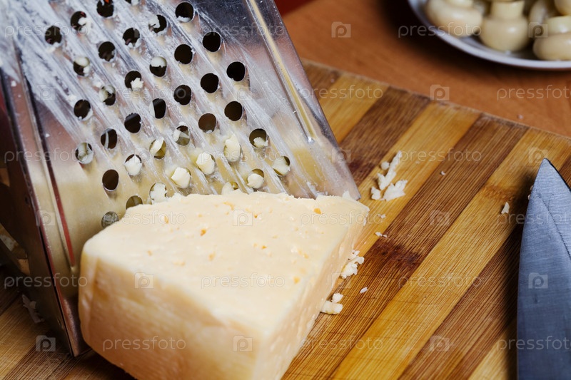 Сыр натирается на терке, рядом маринованные грибы и нож