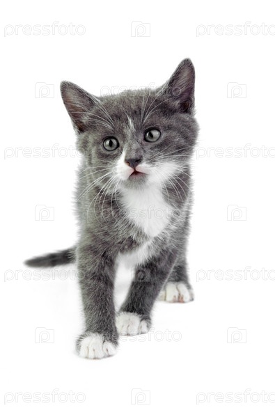 Маленький серый котенок на белом фоне