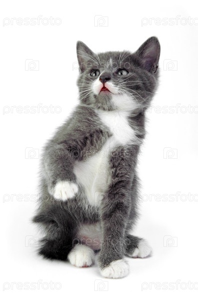 Маленький серый котенок на белом фоне