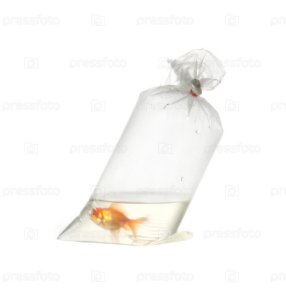 Рыбка в полиэтиленовом пакете на белом фоне