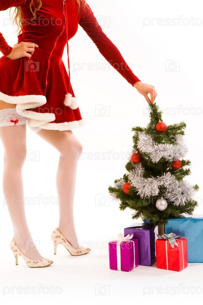 Изображение ног снежной девочки, стоящей у украшенной рождественской елки