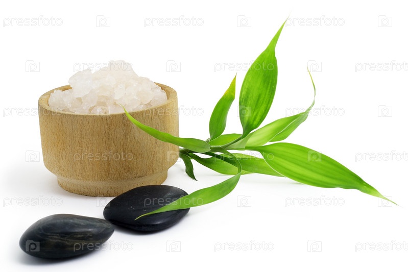 Зеленый бамбук, соль на белом фоне