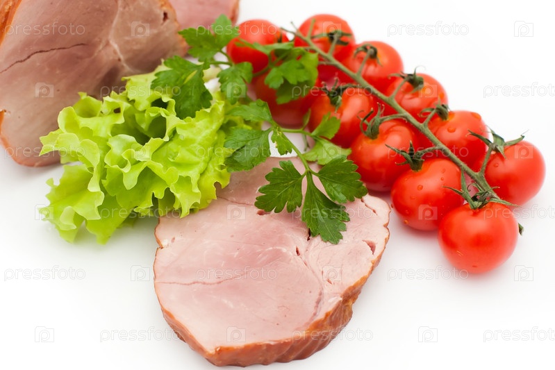Копченое мясо с веткой красных помидор и зеленью