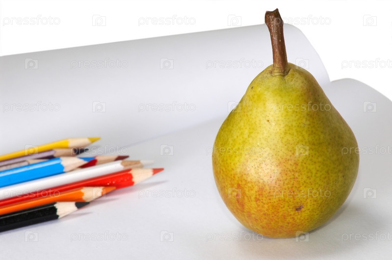 Спелая груша и цветные карандаши лежат на альбоме