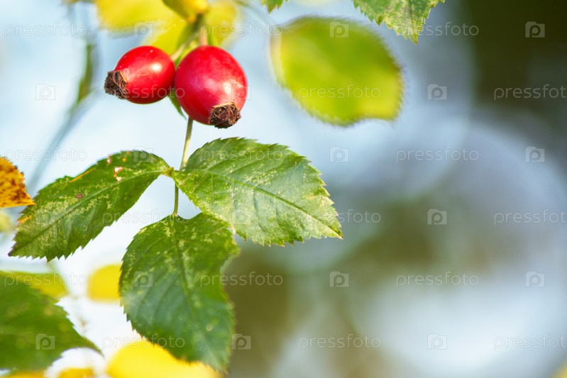 Красные ягоды шиповника на ветке