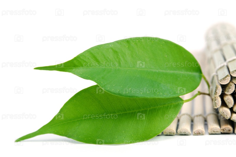 Зеленые листья на бамбуковой циновке