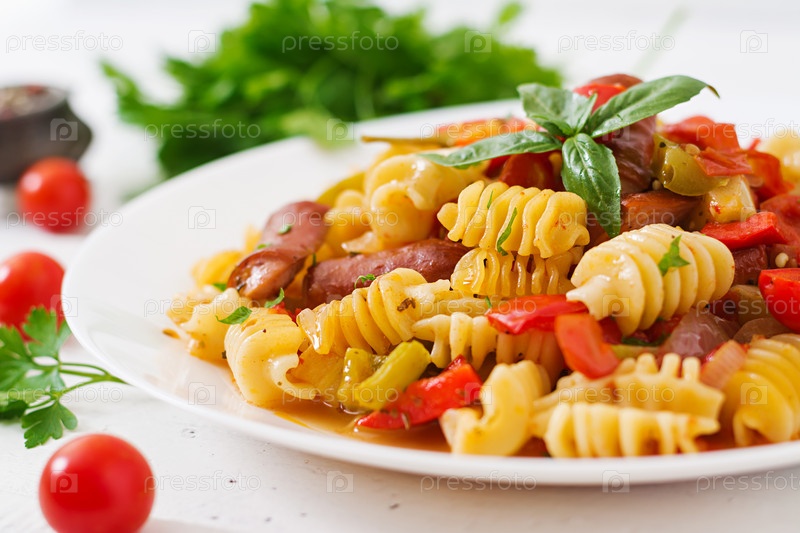 Макароны с томатным соусом и колбасками