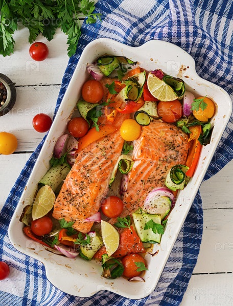 Запеченное филе лосося с овощами