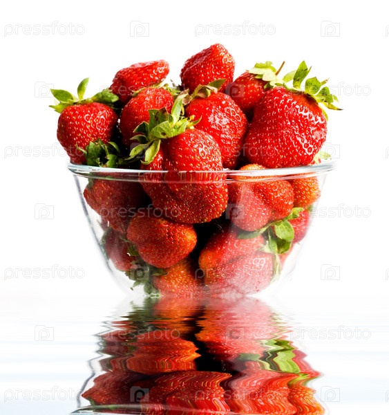 Красная свежая клубника в миске с отражением в воде