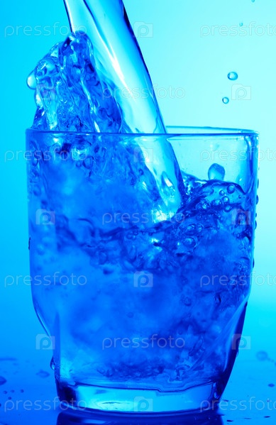 В стеклянный стакан наливают воду на голубом фоне