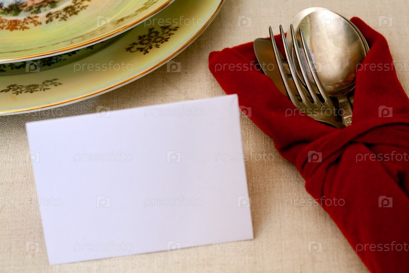 Столовые приборы в красной салфетке у тарелок