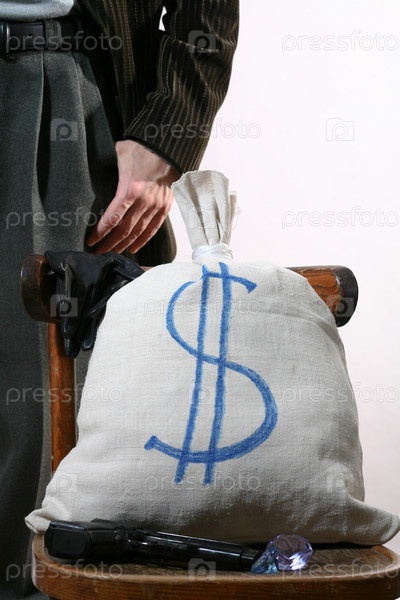 Мешок денег, пистолет и драгоценные камни на стуле у молодого человека