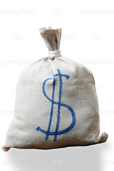 Мешок денег крупным планом на белом фоне