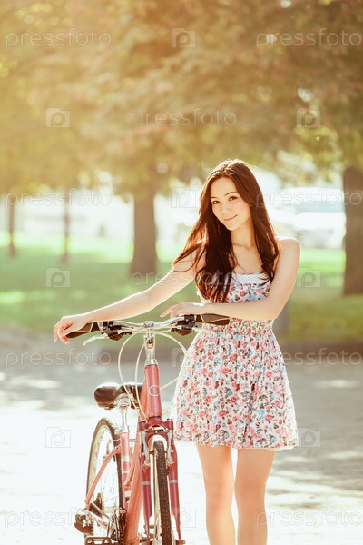 Молодая девушка с велосипедом в парке