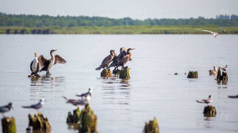 Бакланы и чайки на озере