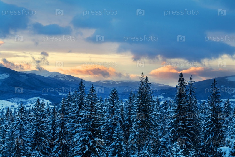 Голубой рассвет в горах и ели в снегу