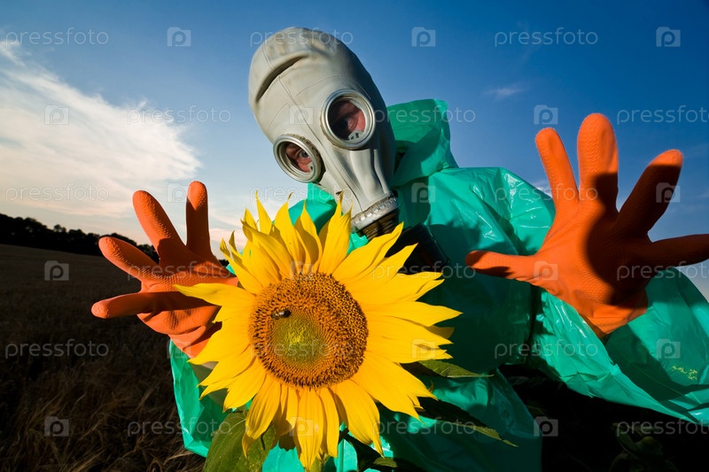 Человек в респираторе на поле подсолнечника