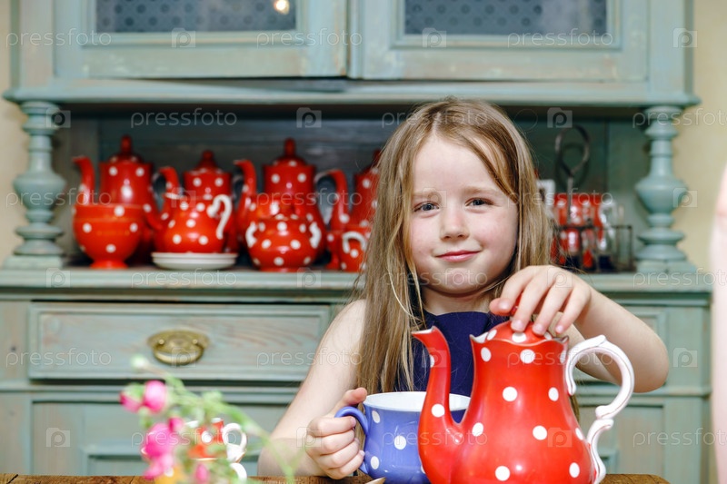Милая маленькая девочка готовит чай