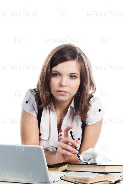 Портрет красивой студентки, которая готовится к экзаменам