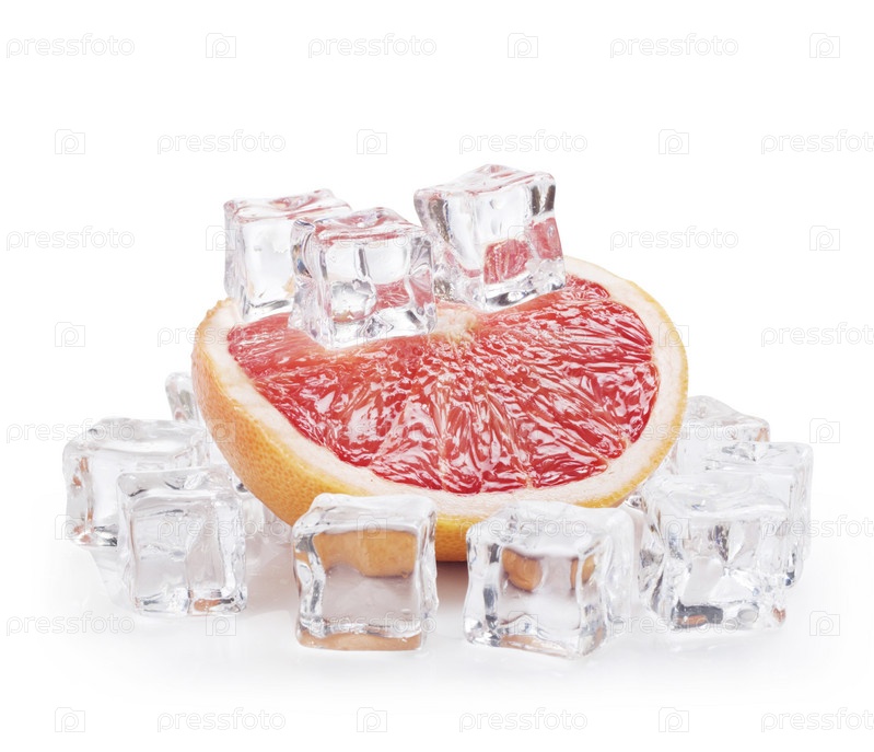 Грейпфрут с кубиками льда на белом фоне