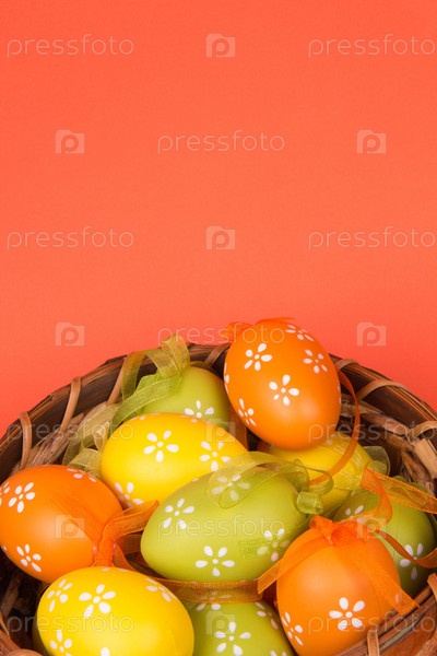 Пасхальные яйца в корзине на оранжевом фоне