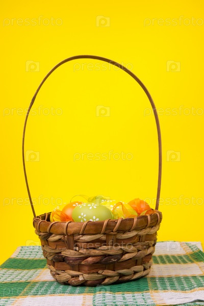 Пасхальные яйца в корзине на желтом фоне
