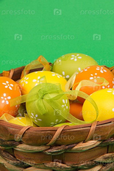 Пасхальные яйца в корзине на зеленом фоне