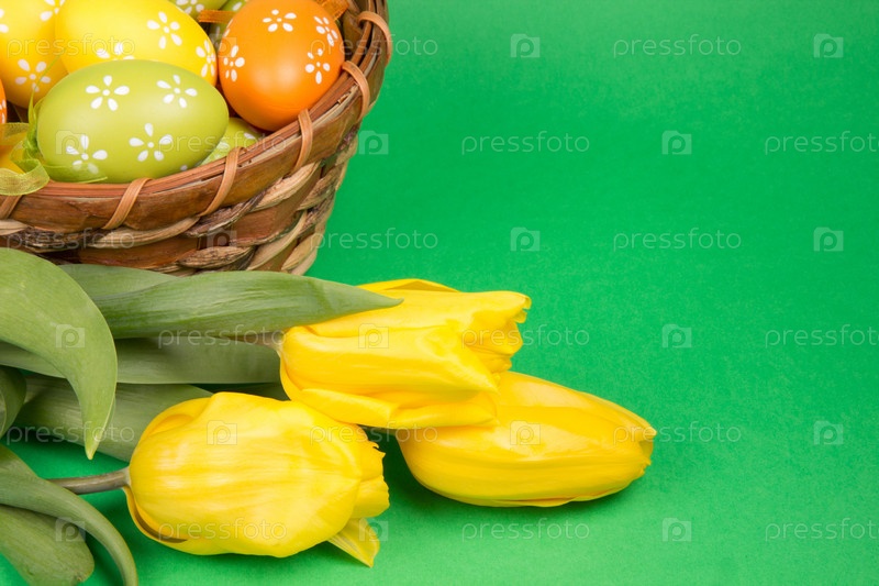 Пасхальные яйца и желтые тюльпаны