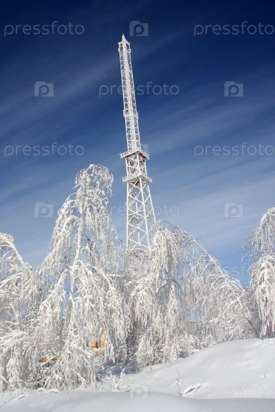 Снежные деревья на фоне башни