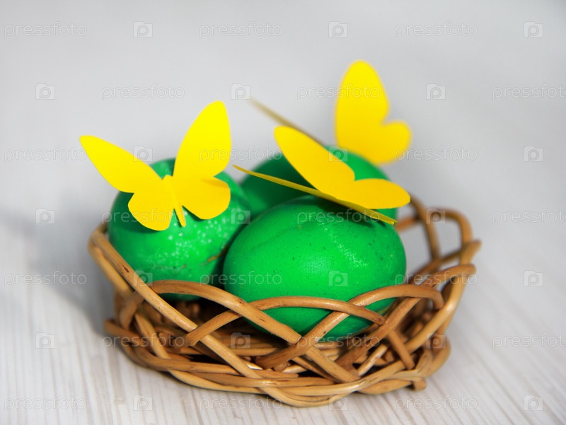Пасхальные яйца с бумажными бабочками в корзине