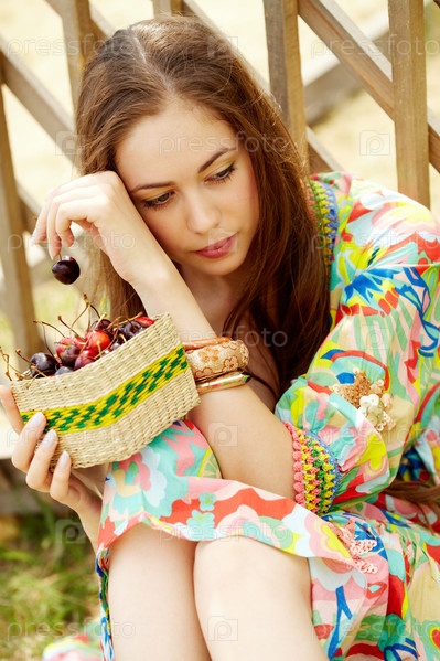 Красивая молодая женщина с черешней в корзинке