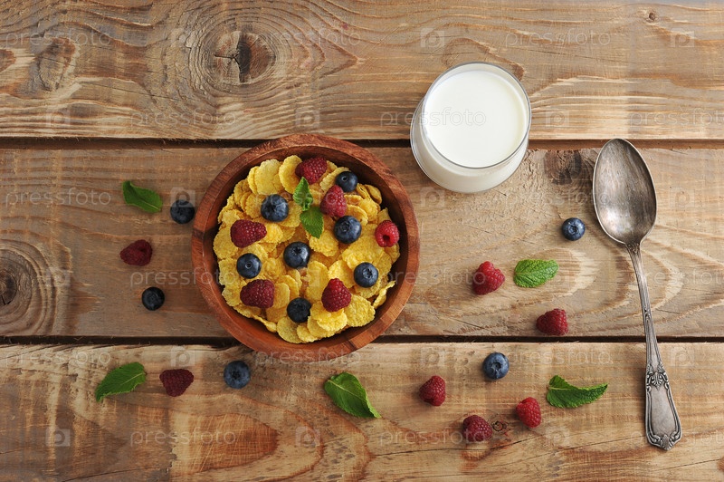 Хлопья и молоко с черникой и малиной