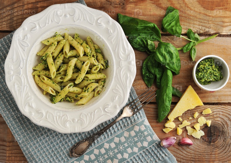 Макароны с соусом песто, базиликом и сыром