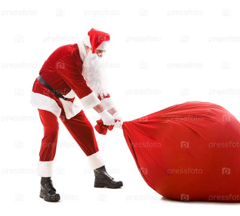 Портрет счастливого Санты, несущего тяжелый большой красный мешок с подарками