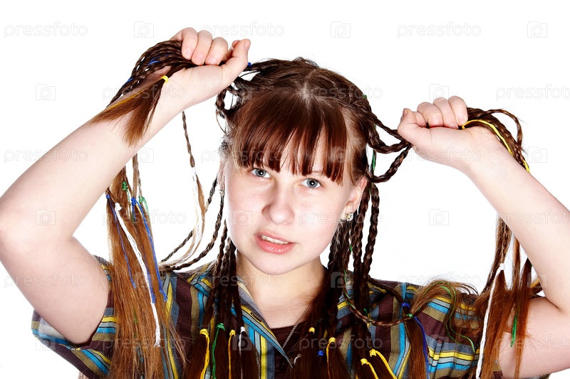 Девушка с косичками на белом фоне