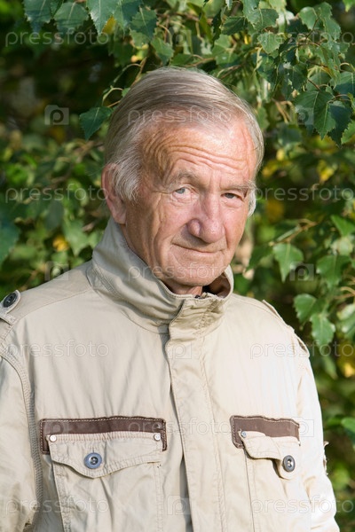 Седой пожилой мужчина в бежевой куртке в деревне на природе