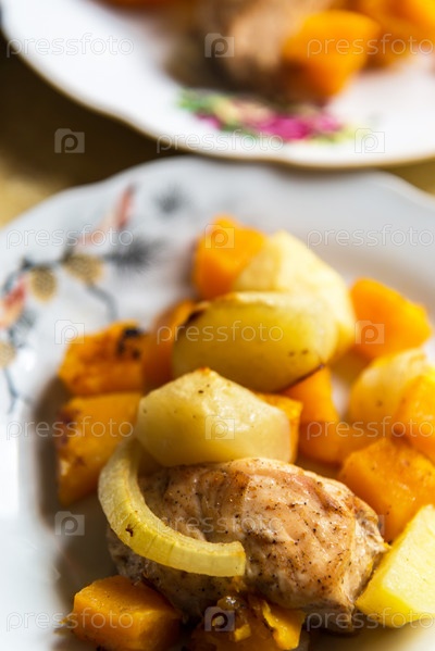Курица, запеченная с ломтиками картофеля и тыквы