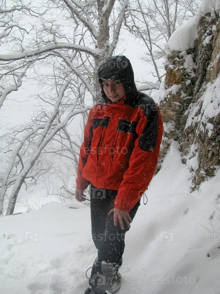Турист зимой в горах Кавказа